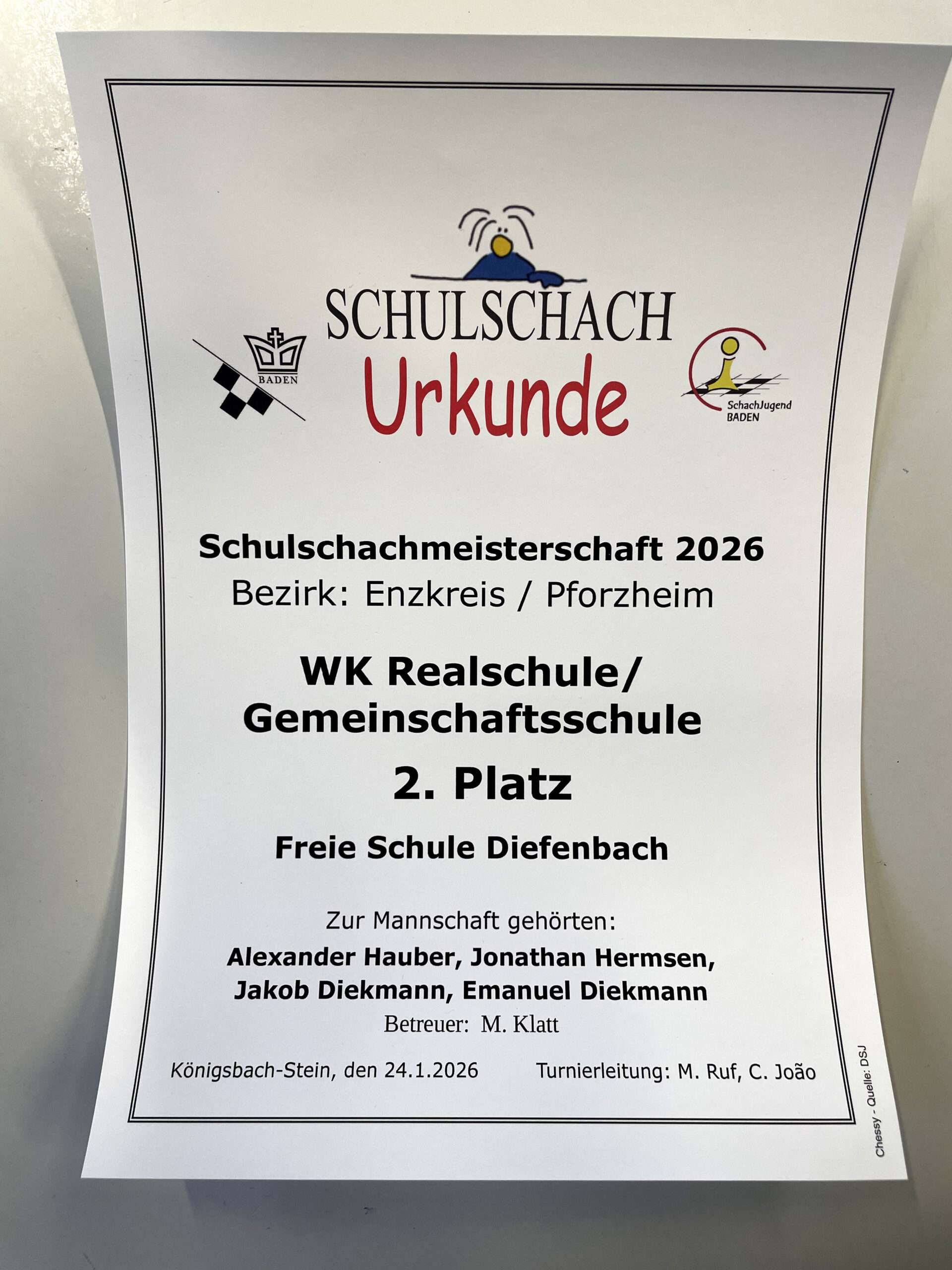 Das neue Schachjahr fing für die Freie Schule Diefenbach wieder sehr gut an: am letzten Samstag, den 24.1.2026 fuhren vier Schüler mit ihrem Lehrer Herrn Klatt zur Schulschachmeisterschaft nach Königsbach Stein ins Lise-Meitner Gymnasium. Dort finden jedes Jahr die Pforzheim/Enzkreis Schachmeisterschaften statt. Wir nahmen in der Kategorie „Realschule“ teil. Unsere vier Schüler Jonathan Hermsen Kl.10, Alexander Hauber Kl.9, Emanuel Dieckmann und sein Bruder Jakob aus Kl.9 bildeten das Team. Gespielt wird immer mit Schachuhr über eine Zeitdauer von 2 mal 20 Minuten. Nach 6 spannenden Runden durften sich die vier Jungen über ihren tollen Erfolg freuen. Sie belegten in der Realschulwertung den 2.Platz, punktgleich mit dem Sieger der Mörike Realschule. Uns trennten nur 1,5 Brettpunkte! Trotz des knapp verpassten Sieges war die Freude groß. Schachspielen hat an der Freien Schule Diefenbach eine lange Tradition. Im Rahmen unserer „Kunstkurse“ (diese finden an vier Wochen im Schuljahr statt) und einer wöchentlichen Schach AG haben Schülerinnen und Schüler immer wieder die Gelegenheit, dieses faszinierende und spannende Spiel kennenzulernen und zu erleben, dass Schachspielen eine tollt Freizeitbeschäftigung ist, die Konzentrationsfähigkeit schult und großen Spaß macht!
